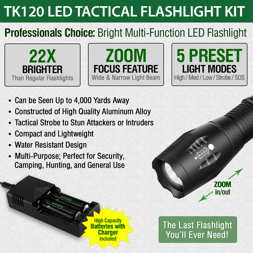 The TK120 LED Flashlight is a complete professional LED flashlight kit for home use, outdoor activities, security and professionals. Equipped with multiple light modes, the TK120 LED Tactical Flashlight delivers excellent light spread when using the zoom feature (adjustable focus). Constructed using high-quality standards, the TK120 Professional LED Flashlight is made of aircraft grade aluminum alloy with a hardened anodized finish. So when the going gets tough the TK120 Flashlight gives you high-strength and durability needed for nearly any situation.