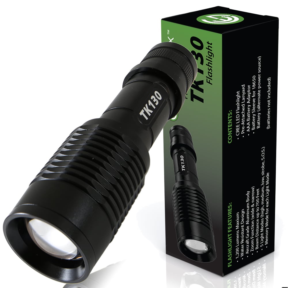 The TK130 LED Flashlight offers multiple light modes and delivers excellent light spread when using the adjustable zoom focus feature. Made of aircraft grade aluminum alloy, the TK130 is a reliable battery-powered AAA flashlight with a zoom focus beam ideal for many situations. The TK130 Flashlight gives you high-strength and durability and is perfect camping, hunting, fishing and multiple other activities. It is also a very useful LED emergency flashlight to aid in emergency assistance and natural disasters including earthquakes, hurricanes and storms.